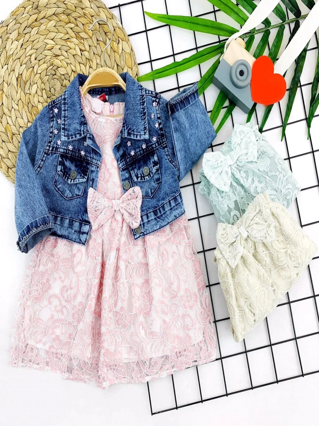 LitaeTrend 2-3-4-5 Yaş Kot Ceketli Astarlı Güpürlü 2li Kız Çocuk Elbisesi Yeşil