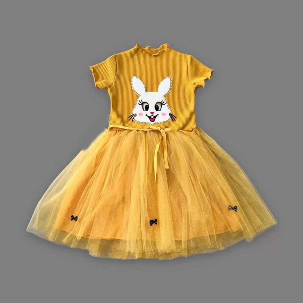 LitaeTrend 5-6-7 Yaş Payetli Tavşan Baskılı Kız Çocuk Elbisesi Hardal