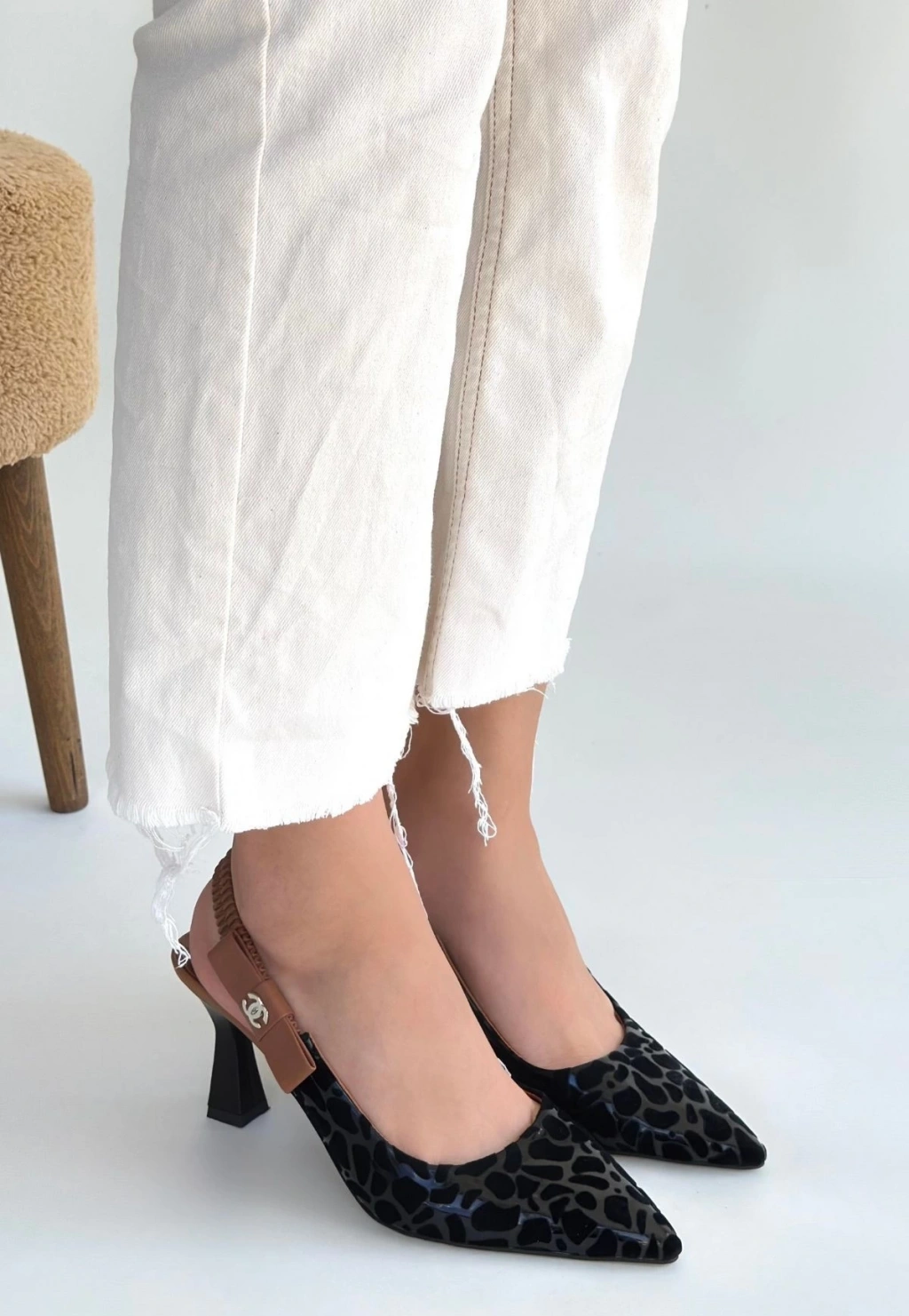 Toran Beyaz Rugan Siyah Süet Detaylı Topuklu Ayakkabı